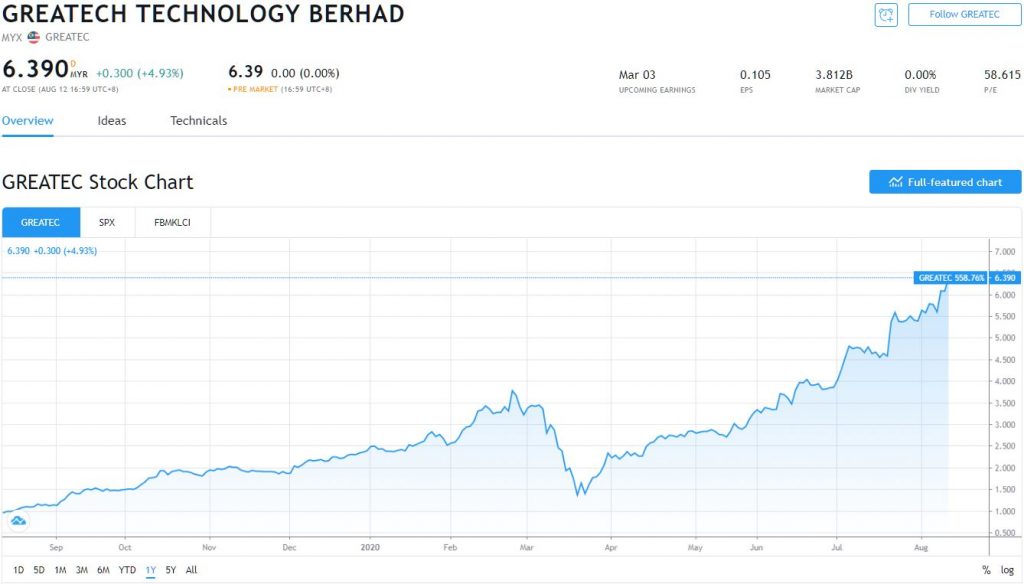Harga saham Greatec naik sebanyak 558% dalam tempoh hanya satu tahun. Harga dari RM1 naik kepada RM6++.