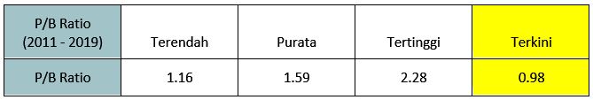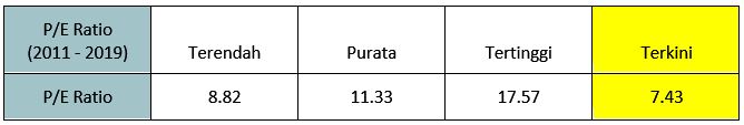 Kalau kita bandingkan dengan P/E Ratio lepas (2011 – 2019), P/E Ratio BIMB terkini adalah terendah berbanding tempoh 9 tahun tersebut.