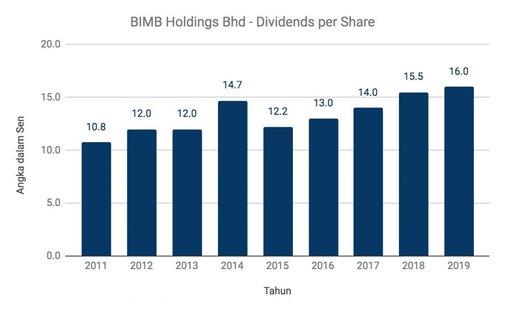 BIMB telah membayar sebanyak 16.0 sen di dalam dividen sesaham pada 2019. Dengan itu, terbuktilah ia sebuah syarikat yang telah membayar dividen secara meningkat dan konsisten sepanjang 9 tahun tersebut.