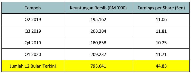 Ia telah mengaut RM793.6 juta dalam keuntungan bersih atau 44.83 sen dalam Earnings Per Share (EPS) daripada Q2 2019 kepada Q1 2020.