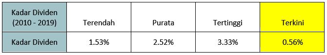 Maka, kadar dividen terkini bagi Top Glove ialah 0.56% setahun, terendah kalau dibandingkan dengan kadar dividen Top Glove yang lepas (2010 – 2019).