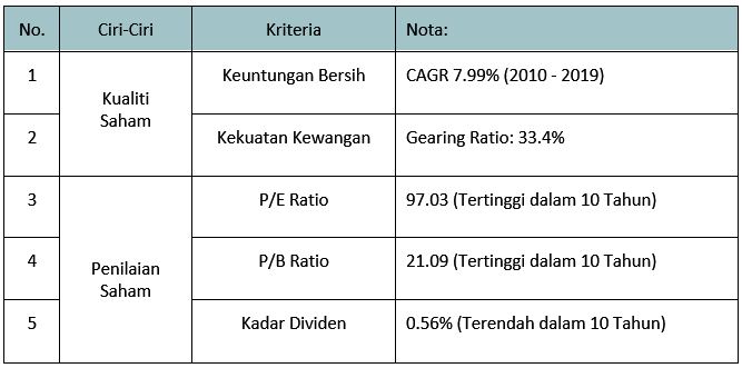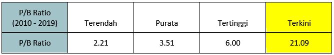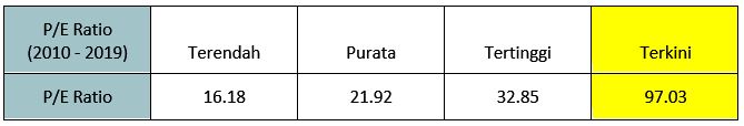 Kalau kita bandingkan dengan P/E Ratio lepas (2010 – 2019), P/E Ratio-nya terkini adalah tertinggi dalam masa 10 tahun tersebut.