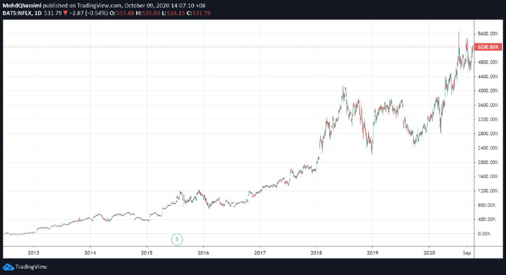 Begitu juga dengan Netflix, bila kita laburkan RM1,000 pada tahun 2013, ia mampu memberikan pulangan sebanyak RM50,000 pada tahun ini. Pelaburan yang sangat menguntungkan tak sampai 10 tahun!