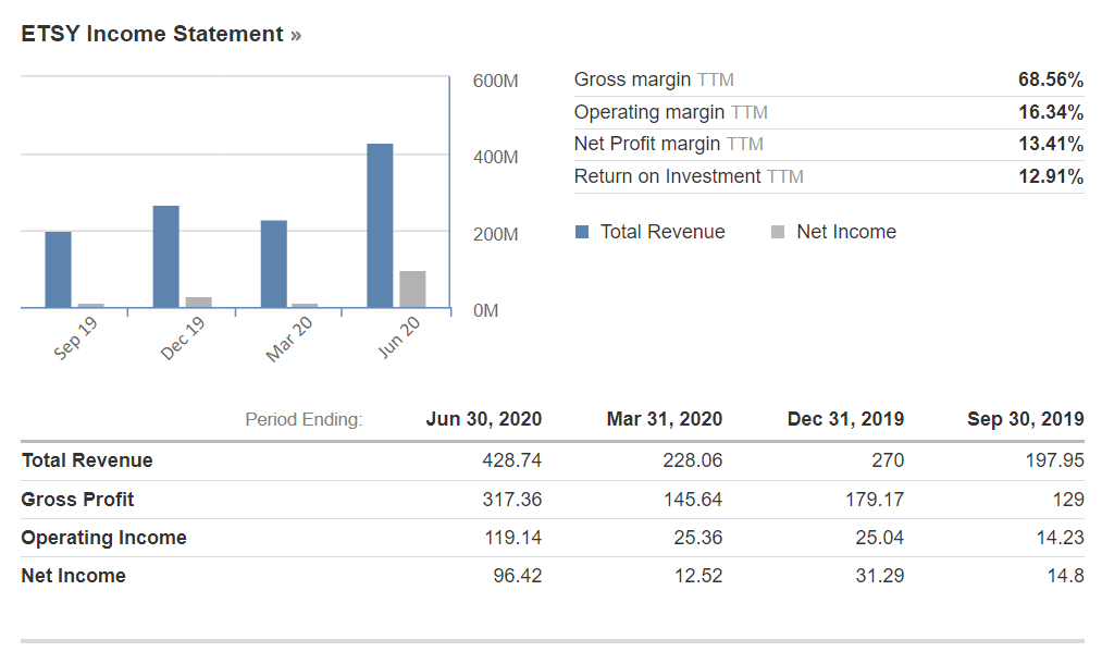 Modal pasaran ETSY adalah sebanyak USD17.5 bilion. Untuk 6 bulan pertama yang berakhir 30 Jun 2020, hasil jualan ETSY Inc meningkat 87% kepada USD656.8 juta. Keuntungan bersih adalah sebanyak USD463 Juta. Setakat laporan kewangan terakhir yang dikeluarkan ETSY, mereka mempunyai wang tunai sebanyak USD234.23 Juta.