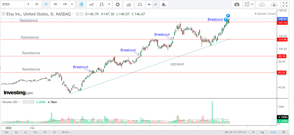Melihat pada carta, ETSY masih berada dalam aliran uptrend sejak kejatuhan saham pada bulan Mac yang lalu. Betapa mudahnya saham apabila kita melengkapkan diri kita dengan ilmu teknik membeli saham seperti teknik breakout. Jika dilihat kepada carta, saham ini telah beberapa kali melakukan breakout. Bayangkan jika kita beli pada breakout pertama, kini sudah mendapat pulangan lebih daripada 100%.