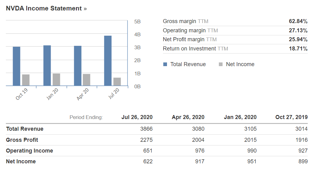 Untuk 26 minggu pertama tahun 2020 yang berakhir pada 26 Julai 2020, NVIDIA Corporation menyaksikan hasil jualan meningkat sebanyak 45% kepada USD6.95 bilion. Pecahan hasil jualan daripada nilai tersebut menyaksikan segmen grafik menyumbang sebanyak USD3.99 bilion manakala segmen pengkomputeran dan rangkaian menyumbang sebanyak USD2.96 bilion.
