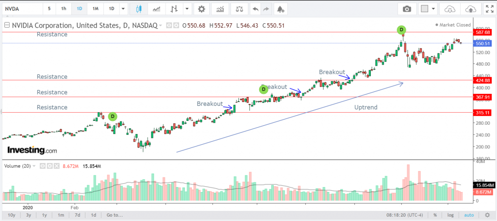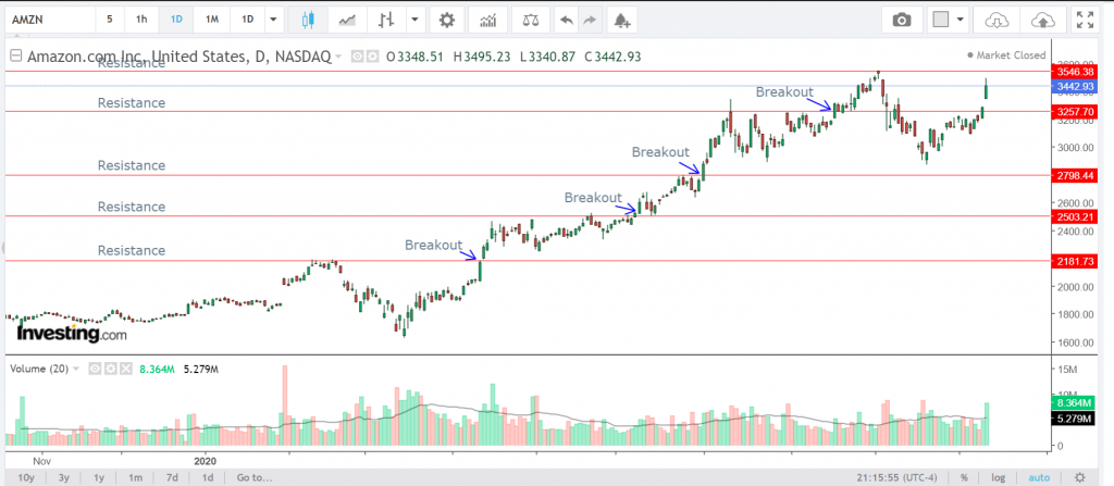 Amazon berjaya membuat All-Time High pada breakout yang pertama dan setiap kali breakout, harganya adalah All-Time High yang baru. Secara keseluruhannya, Amazon masih berada dalam fasa uptrend. Sekiranya sedang mencari entry terbaik bagi saham ini, adalah seeloknya kita tunggu sehingga ia berjaya memecahkan paras resistance terlebih dahulu dan membuat breakout.