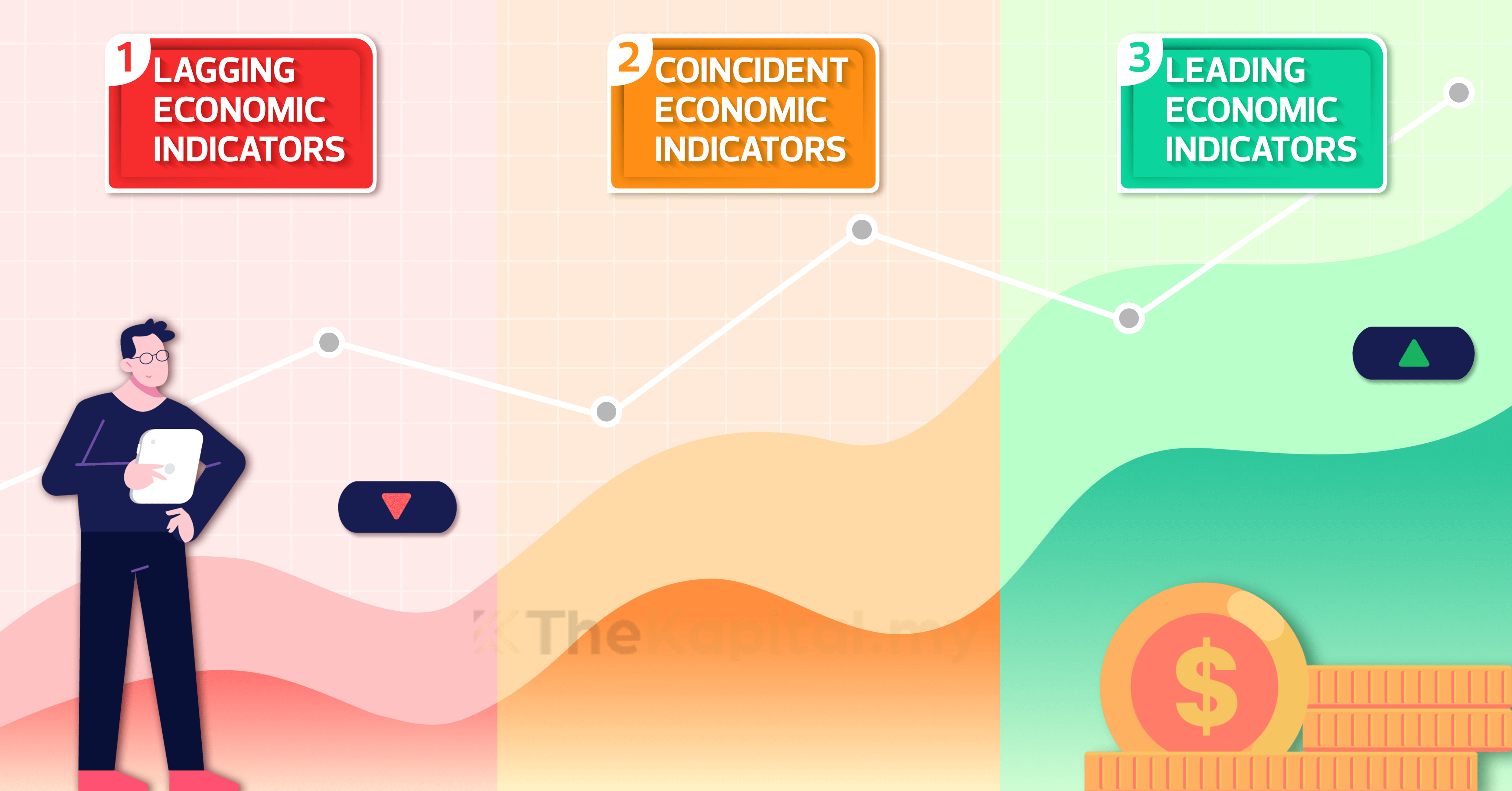 Indikator ekonomi ini terbahagi kepada tiga bahagian utama iaitu petunjuk ekonomi terdahulu (Leading economic indicators), petunjuk ekonomi secara kebetulan (Coincident economic Indicators) dan petunjuk ekonomi yang terkemudian (Lagging economic indicators). Pelabur yang cekap akan menggunakan indikator-indikator ini untuk merancang pelaburan mereka dan menjana keuntungan daripada maklumat yang diperolehi ini.