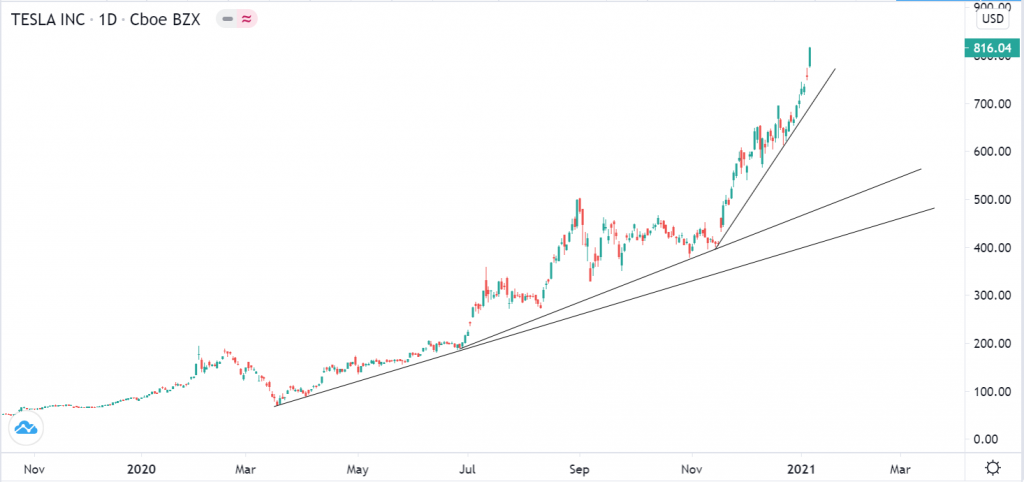 Saham Tesla setakat ini dilihat masih lagi uptrend dan belum lagi mematahkan trendline. Selagi saham ini belum mematahkan trendline tersebut, maka boleh lah layan sahaja kaunter Tesla ini. Harga saham Tesla yang mencecah paras All-Time High ini telah menyebabkan Elon Musk dinobatkan sebagai orang terkaya dunia pada 8 Januari 2021.