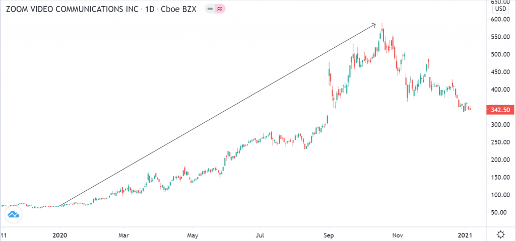 Syarikat yang menyediakan perkhidmatan mesyuarat dalam talian seperti syarikat Zoom Video Communications mendapat manfaat daripada situasi ini. Harga saham Zoom pada 2 Januari 2020 adalah USD68.72 dan harga saham Zoom pada 31 Disember 2020 adalah USD337.32. Tahukah anda Zoom pernah mencecah paras harga USD568.34 pada 19 Oktober 2020?
