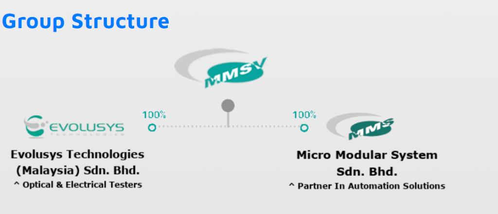 MMS Ventures Berhad ditubuhkan pada tahun 2004. MMSV mempunyai dua anak syarikat iaitu Micro Modular System Sdn Bhd (MMS) dan Evolusys Technologies Sdn Bhd (Evolusys). Kumpulan MMS terlibat dengan reka bentuk dan pembuatan LED serta sistem automasi semikonduktor industri dan peralatan mesin. Evolusys pula terlibat dengan pembangunan sistem.