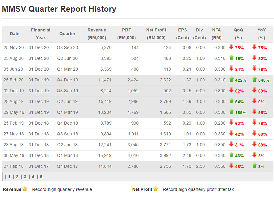 Syarikat ini mencatatkan sedikit kemerosotan pada hasil pendapatan dan juga keuntungan bersih syarikat pada tahun lepas. Laporan suku ketiga tahun 2020 menunjukkan MMSV membuat kejatuhan sebanyak 75% untuk kedua-dua QoQ dan juga YoY.