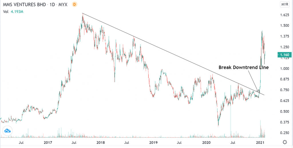 Secara teknikalnya, MMSV telah berjaya memecahkan downtrend line pada 23 Disember 2020 yang lalu. MMSV membuat downtrend sejak tahun 2017 dan setelah 3 tahun, akhirnya MMSV berjaya mengakhiri downtrend tersebut dan membuat perubahan trend.