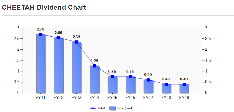 Syarikat yang memberi dividen kepada para pemegang sahamnya adalah syarikat yang membuat keuntungan. Mana ada syarikat yang rugi mampu beri dividen kepada para pemegang sahamnya. Meskipun Cheetah secara konsisten memberi dividen setiap tahun, namun dapat dilihat pemberian dividen semakin berkurangan sejak tahun 2011.