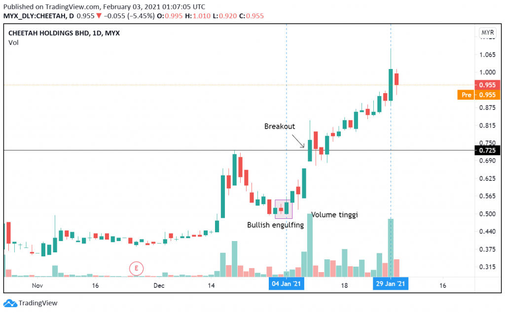 Kenaikan harga saham Cheetah dilihat lebih bersifat teknikal di mana setelah Cheetah membuat pullback, Cheetah membuat bullish reversal candlestick iaitu bullish engulfing pada hari pertama pasaran dibuka tahun 2021.