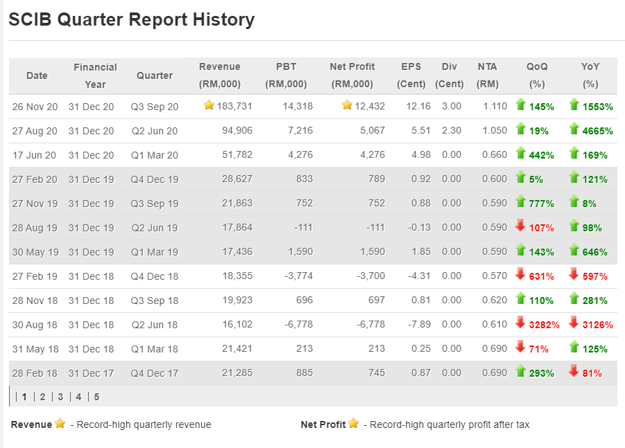 SCIB menunjukkan prestasi yang sangat memberangsangkan sejak tahun 2019. Hasil pendapatan dan juga keuntungan bersih syarikat terus menunjukkan peningkatan dan dilihat langsung tidak terkesan dengan pandemik yang sedang melanda dunia. Malah suku yang terkini iaitu suku ketiga 2020 menunjukkan SCIB mencatatkan satu rekod baru syarikat dengan hasil pendapatan dan keuntungan bersih tertinggi syarikat bagi satu suku tahunan.