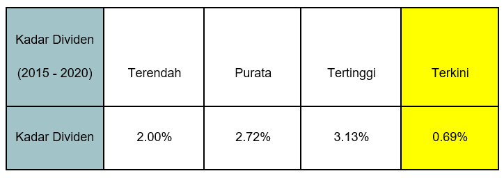 Jika MPI di bandingkan dengan kadar dividen tahun-tahun yang lalu (2015 sehingga tahun2020), nisbah terkini merupakan yang terendah dalam 6 tahun tersebut.