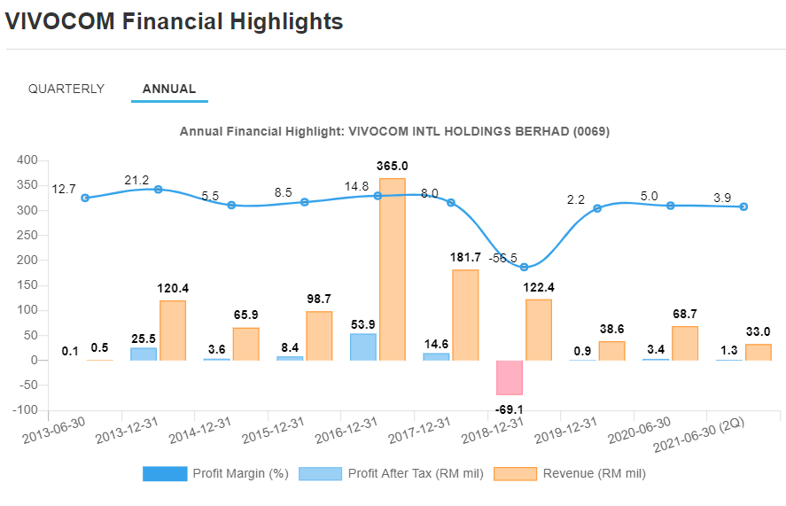 1. Daripada analisis fundamental, Vivocom menunjukkan syarikat ini menunjukkan keuntungan bersih yang konsisten setiap tahun kecuali pada tahun 2018, di mana Vivocom mengalami kerugian besar sebanyak RM69.1 juta pada tahun tersebut.