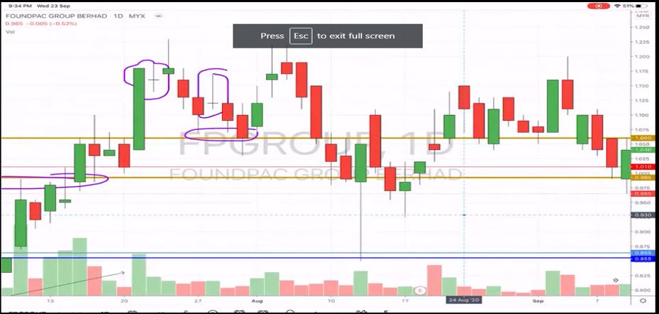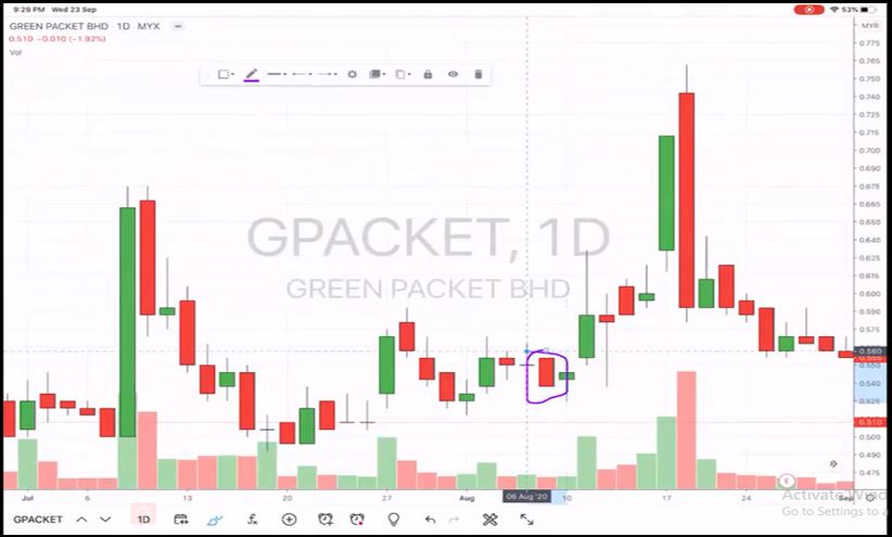 Body price atau candlestick berwarna hijau terbentuk kerana harga ketika kaunter dibuka (opening price) adalah RM 0.20 manakala harga ketika kaunter ditutup (close price) pada pukul 5 petang adalah RM 0.40 lebih tinggi daripada opening price. Namun, mungkin ada yang tertanya berkenaan dengan candlestick dalam bulatan hitam seperti rajah di bawah.