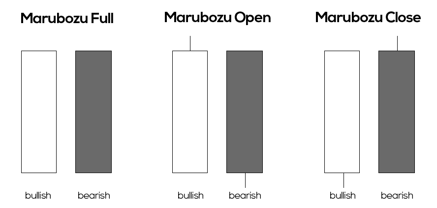 Marubozu tidak mempunyai sebarang lower shadow atau upper shadow. Maksud Marubozu dalam bahasa jepun adalah ‘botak’ atau ‘cukur kepala’. Ini mungkin disebabkan candlestick ini tidak mempunyai sebarang wicks atau shadow.