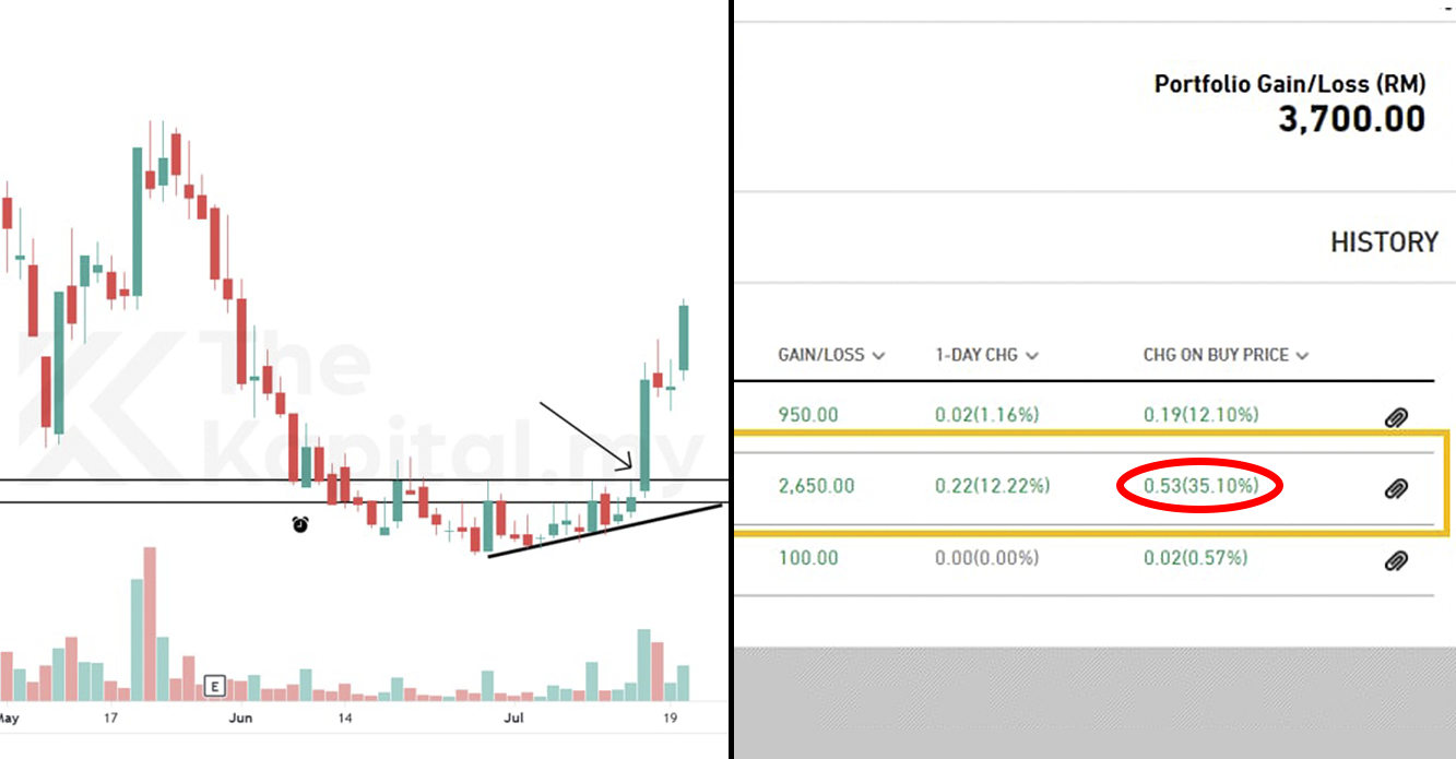 Pada 21 Julai 2021, saham ini sekali lagi membuat breakout. Saham ini hanya dipegang selama 4 hari dagangan dan mampu memberi pulangan sebanyak 35.10%! Anda tidak perlu tergesa-gesa menjual saham ini selagi harganya tidak jatuh menghampiri harga yang anda beli.
