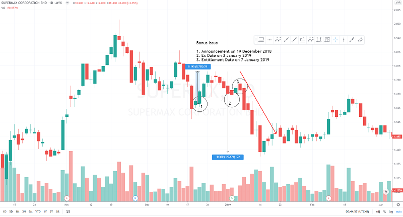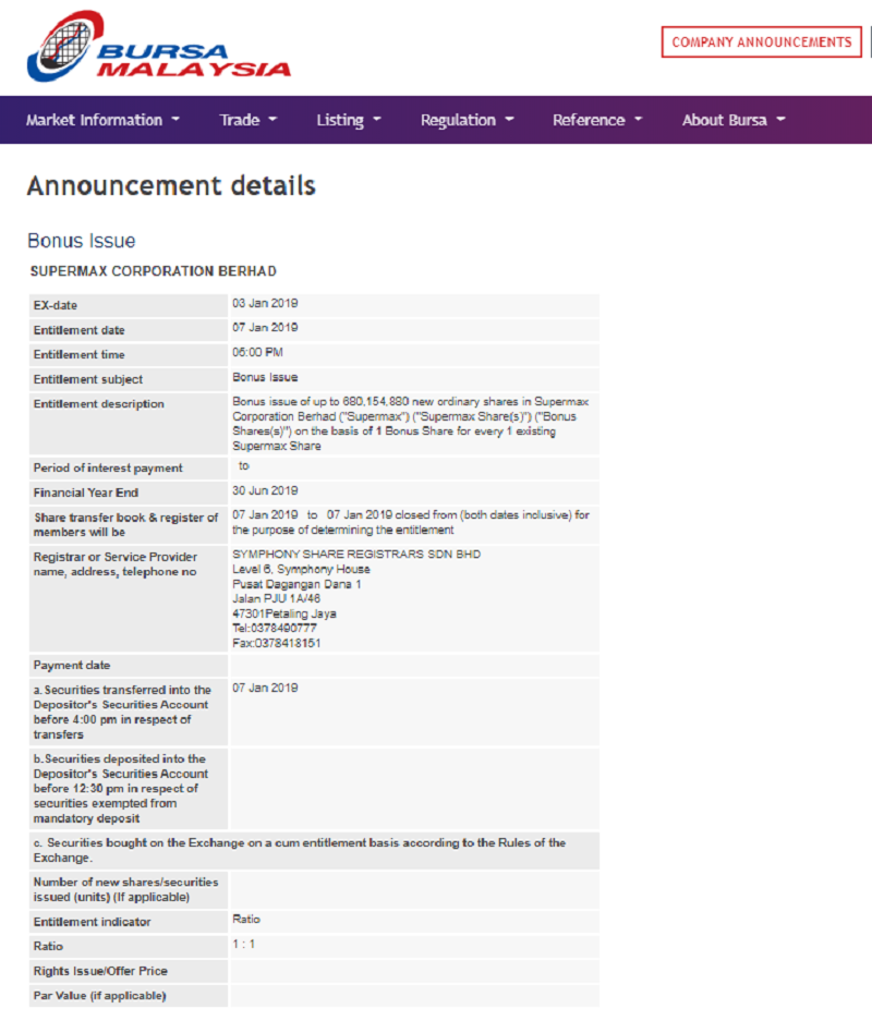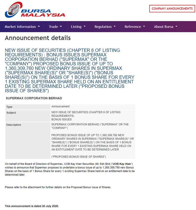 Sebagai contoh yang terbaru, Supermax Corporation Berhad bakal mengumumkan Bonus Issue 1:1 pada tarikh yang akan ditentukan kelak. Antara yang boleh diperhatikan oleh para pelabur atau pedagang adalah tarikh Ex-Date dan Entitlement Date pada pengumuman yang akan datang. Berikut adalah pengumuman yang dikeluarkan oleh syarikat pada 20hb Julai 2020.