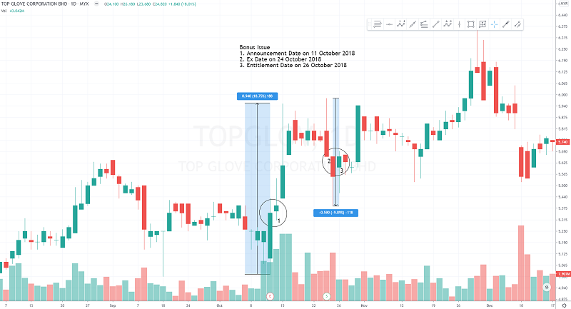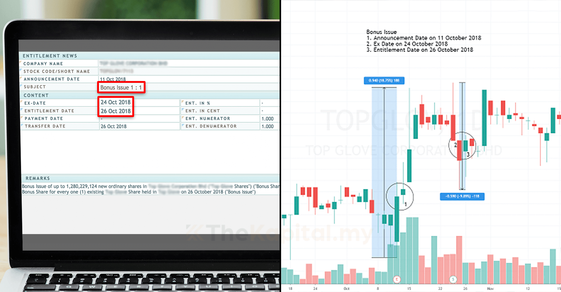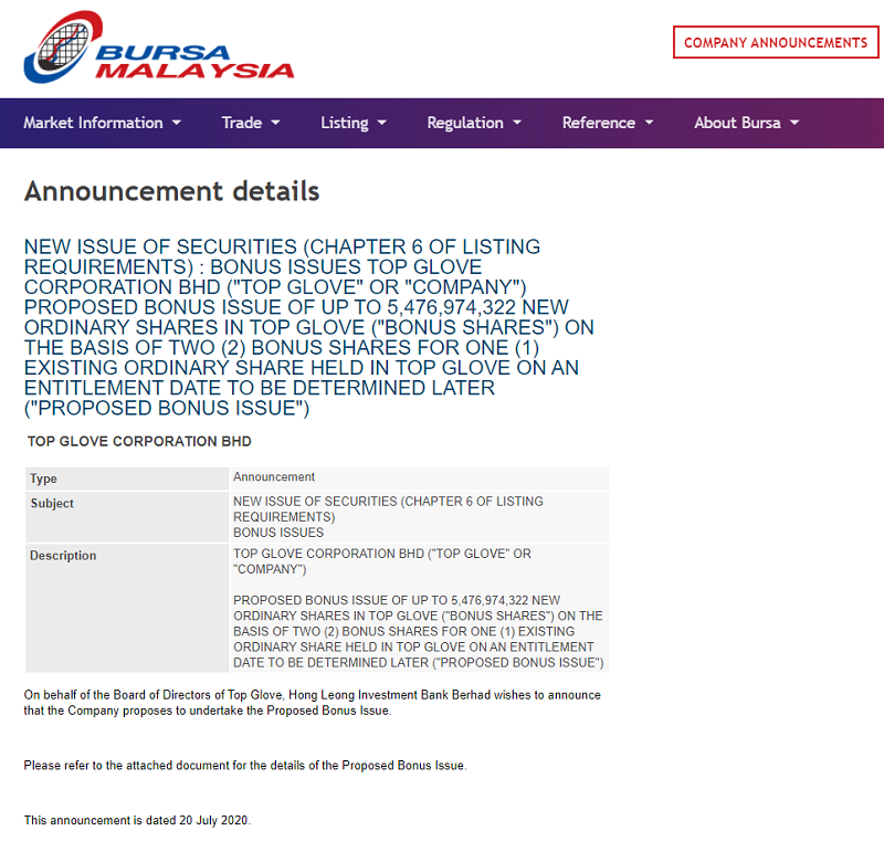 Case Study Top Glove Corporation Berhad Sebagai contoh Top Glove Corporation Berhad juga bakal mengumumkan Bonus Issue 2:1 pada tarikh yang akan ditentukan kelak. Antara yang boleh diperhatikan oleh para pelabur atau pedagang adalah tarikh Ex-Date dan Entitlement Date pada pengumuman yang akan datang. Berikut adalah pengumuman yang dikeluarkan oelh syarikat pada 20hb Julai 2020.