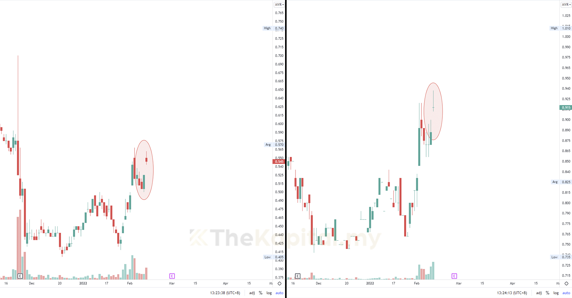 Saham B ini pula secara keseluruhan sedang membuat fasa downtrend dan ditutup pada harga sekitar RM0.525 pada Jumaat lepas. Pada awal sesi dagangan hari ini, harga saham ini melonjak kepada RM0.55 seunit.