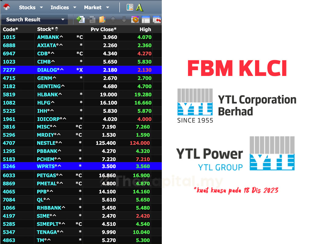 KUALA LUMPUR, 30 Nov (Bernama) — YTL Corp Bhd dan YTL Power International Bhd disenaraikan sebagai dua komponen untuk menggantikan Dialog Group Bhd dan Westports Holdings Bhd dalam senarai 30 konstituen FTSE Bursa Malaysia KLCI (FBM KLCI).
