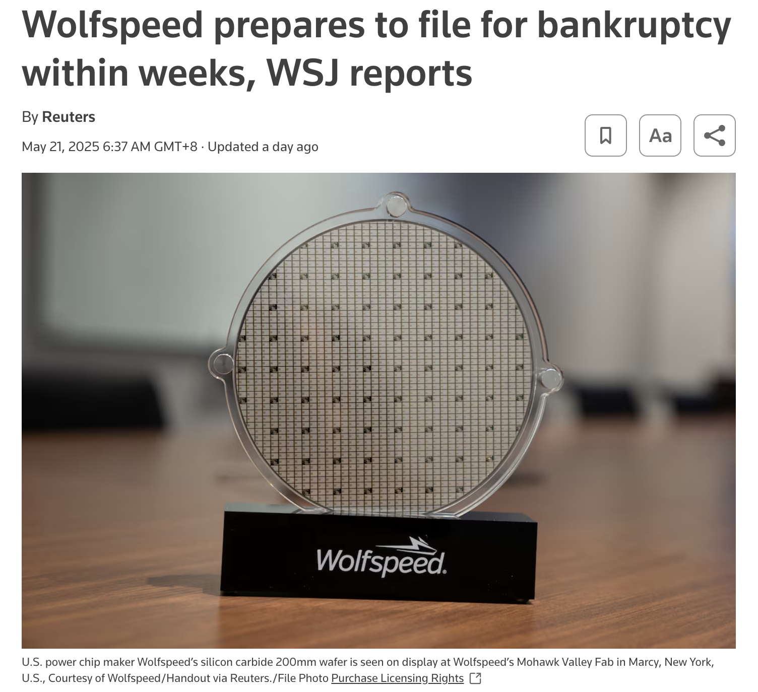 Menurut Wall Street Journal, WOLF sedang bersiap sedia untuk memfailkan muflis Bab 11 dalam beberapa minggu ini disebabkan oleh masalah hutangnya yang semakin menggunung. Syarikat ini terjejas akibat permintaan perlahan, ketidaktentuan daripada pelaksanaan tarif, dan beban perbelanjaan modal yang besar untuk kemudahan pembuatannya. Semua perkara ini diburukkan lagi oleh penurunan ASP untuk wafer SiC. Ia berhasrat untuk memfailkan Bab 11 bagi penstrukturan semula dan bukannya Bab 7 untuk kecairan, setelah ia menolak beberapa usul penstrukturan semula hutang luar mahkamah. WOLF masih berpotensi memperoleh pembiayaan sebanyak USD750j bawah Akta CHIPS dan Sains AS, tertakluk pada pelan penstrukturan semulanya.