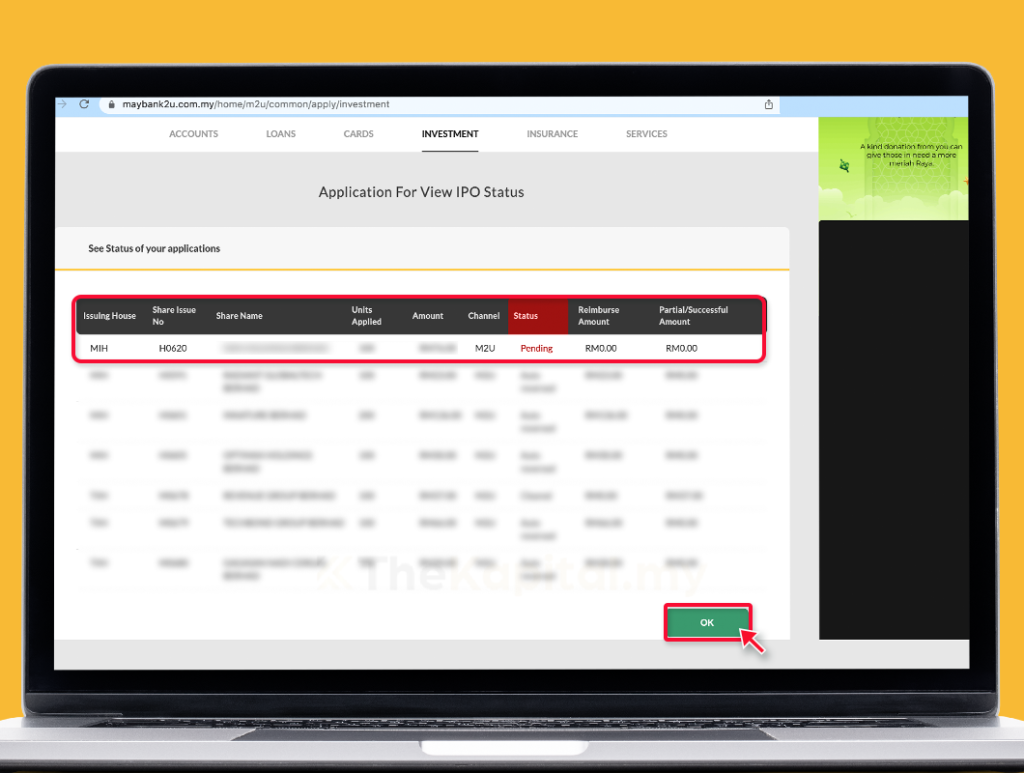 Status permohonan IPO akan dipaparkan. Anda boleh semak status permohonan anda selepas tarikh pengundian tamat atau pada keesokkan harinya.