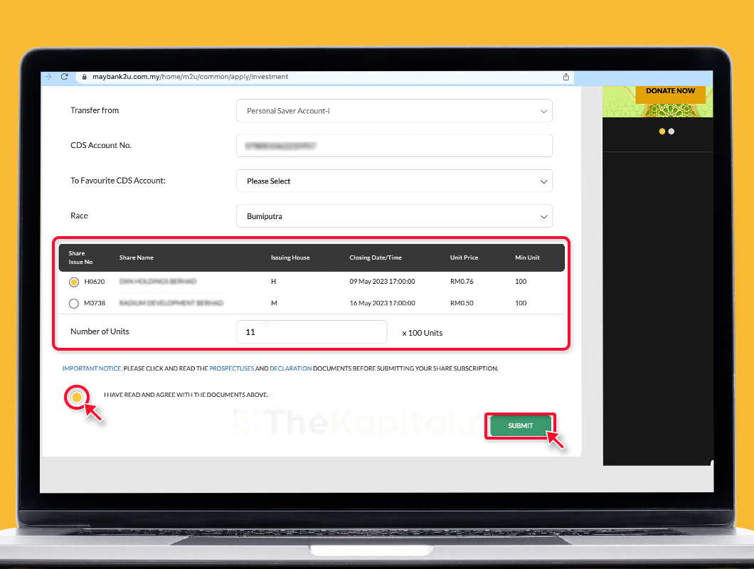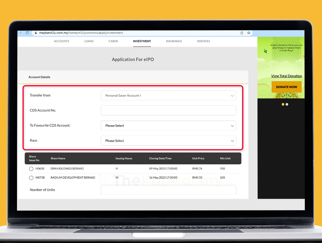 Seterusnya, pilih IPO syarikat yang anda hendak mohon dan lengkapkan maklumat lain seperti jumlah unit permohonan anda. Pastikan duit dalam akaun bank anda cukup untuk jumlah permohonan anda.