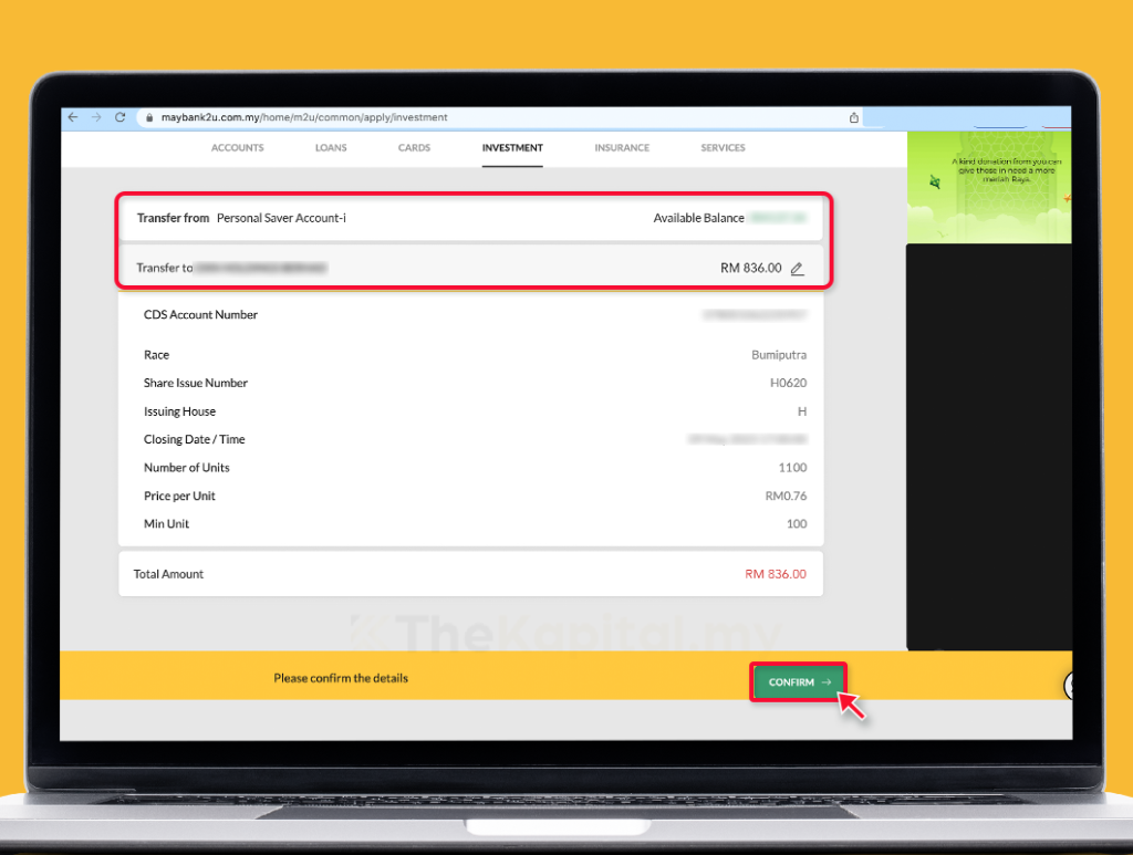Semak maklumat dan sahkan pembayaran. Klik Confirm untuk membuat pembayaran. Permohonan anda akan diundi pada tarikh yang telah ditetapkan dan jika anda terpilih anda akan menerima permohonan IPO anda pada tarikh pengumuman nanti.